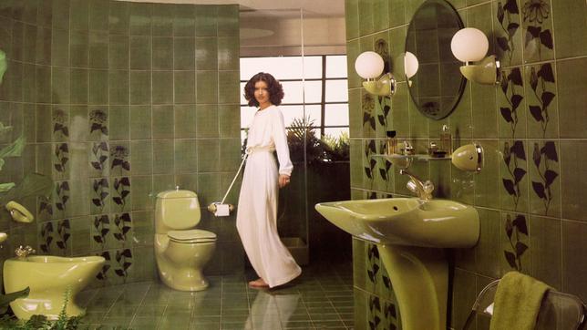Luigi Colani krijgt in 1975 de mooie opdracht om een complete badkameruitrusting te ontwerpen! Hiermee vindt de verandering plaats van het kijken naar producten op zich naar een ruimte met sanitair. Hieronder een foto met een toilet, wastafel of wasbak met zuil, bidet en allerlei badkameraccesoires. Het sanitair is in de kleur mosgroen.