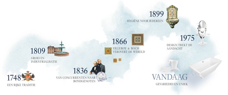 - 1836: Villeroy & Boch markeert 1748 als het begin van V&B maar Jean-Francois Boch en Nicolas Villeroy voegen in 1836 hun 3 fabrieken samen waarmee de reis naar het Europese marktleiderschap een feit is.
