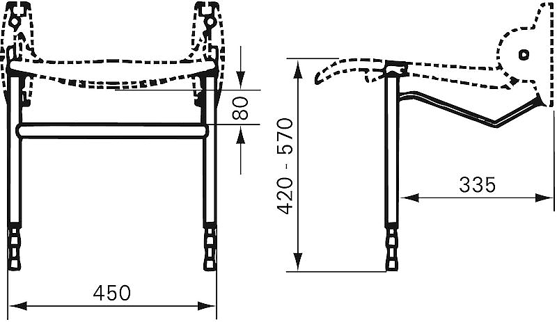 De hulppootset scharniert met de zitting mee, waardoor deze in opgeklapte toestand niet in de weg zit. Neergeklapt steunen de hulppoten af in de juiste positie, geholpen door de afstandhouders.