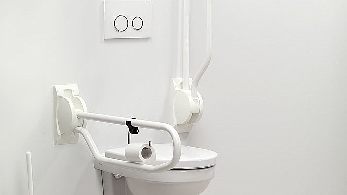 Opgeklapt neemt de beugel minder ruimte in (prettig bij een zijwaartse transfer, maar ook tijdens het schoonmaken van de toiletruimte) en biedt nog steeds betrouwbare steun, bijvoorbeeld voor mannen tijdens het staand urineren.