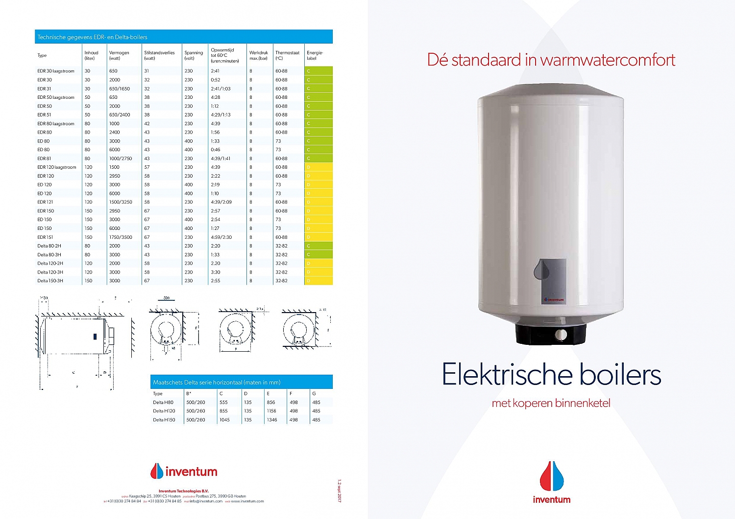 Met de Inventum EDR boilers hebben we voor iedere situatie een maatwerkboiler beschikbaar. Inventum heeft in haar assortiment laagstroom boilers, 2-span boilers, hoogvermogen boilers en hoogvermogen 3 fases boilers. Uniek is de Inventum Delta lijn. Deze zijn gemaakt voor een horizontale montage en kunnen eenvoudig op plaatsten met weinig ruimte geplaatst worden. Verkrijgbaar in verschillende uitvoeringen voor vloer-, wand- en plafondmontage.