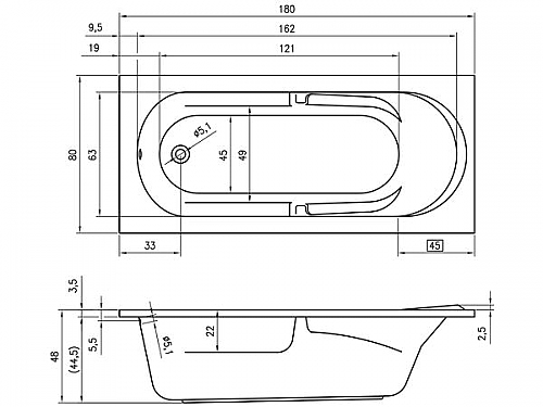 Inbouwbad, hoogglans wit acryl bad, met armsteunen, afvoer bij het voeteneind. Tevens verkrijgbaar met de whirlpoolsystemen: Air of Flow.