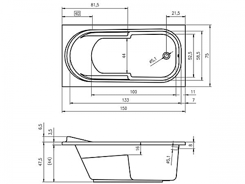 Inbouwbad, hoogglans wit acryl bad, met armsteunen, afvoer bij het voeteneind. Tevens verkrijgbaar met de whirlpoolsystemen: Air of Flow.