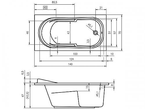 Inbouwbad, hoogglans wit acryl bad, met armsteunen, afvoer bij het voeteneind. Tevens verkrijgbaar met de whirlpoolsystemen: Air of Flow.