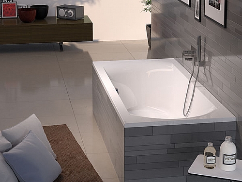 Inbouwbad, hoogglans wit acryl, rechthoekig met afgeronde binnenvorm, afvoer aan de zijkant. Tevens verkrijgbaar met de whirlpoolsystemen: Air, Flow, Joy of Bliss.