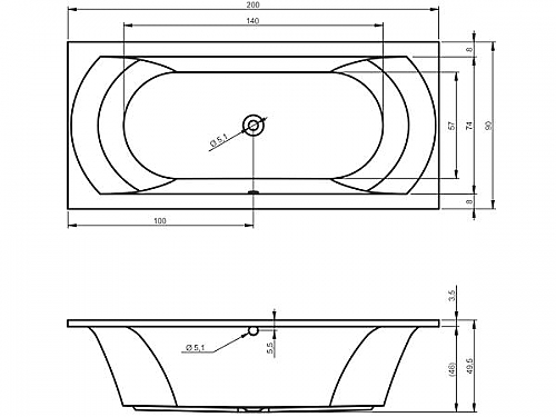 Inbouwbad, hoogglans wit acryl, rechthoekig met afgeronde binnenvorm, afvoer aan de zijkant. Tevens verkrijgbaar met de whirlpoolsystemen: Air, Flow, Joy of Bliss.