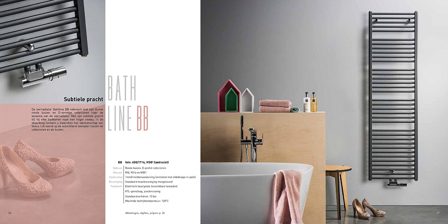 De Vasco BB Bathline designradiator verwijst met zijn ronde dunne buizen naar de essentie van de designradiator. Met zijn subtiele vormen tilt ie elke badkamer naar een hoger niveau. Qua afwerking herken je zeker het vakmanschap waar Vasco voor staat. Als je 'm uitpakt kijk maar eens naar de onzichtbare lasnaden tussen collectoren en buizen!-