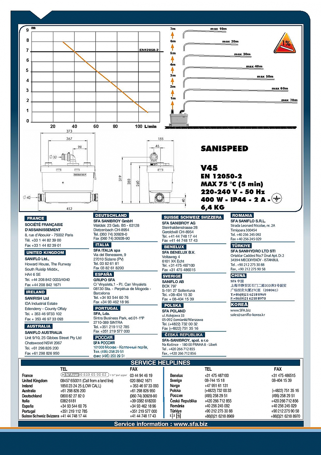 De Sanispeed is een ware krachtpatser vuilwaterpomp uit de Expert-line. Het toestel verzamelt en verpompt afvalwater zonder fecaliën over grote afstanden en hoge opvoerhoogtes. De vele aansluitmogelijkheden bieden DE oplossing voor de afvoer van afvalwater van meerdere sanitaire toestellen. De Sanispeed verpompt afvalwater met een temperatuur van 35°C en kortstondig tot 75°C. DE praktische oplossing voor hotels en wasserijen maar ook bij je thuis.