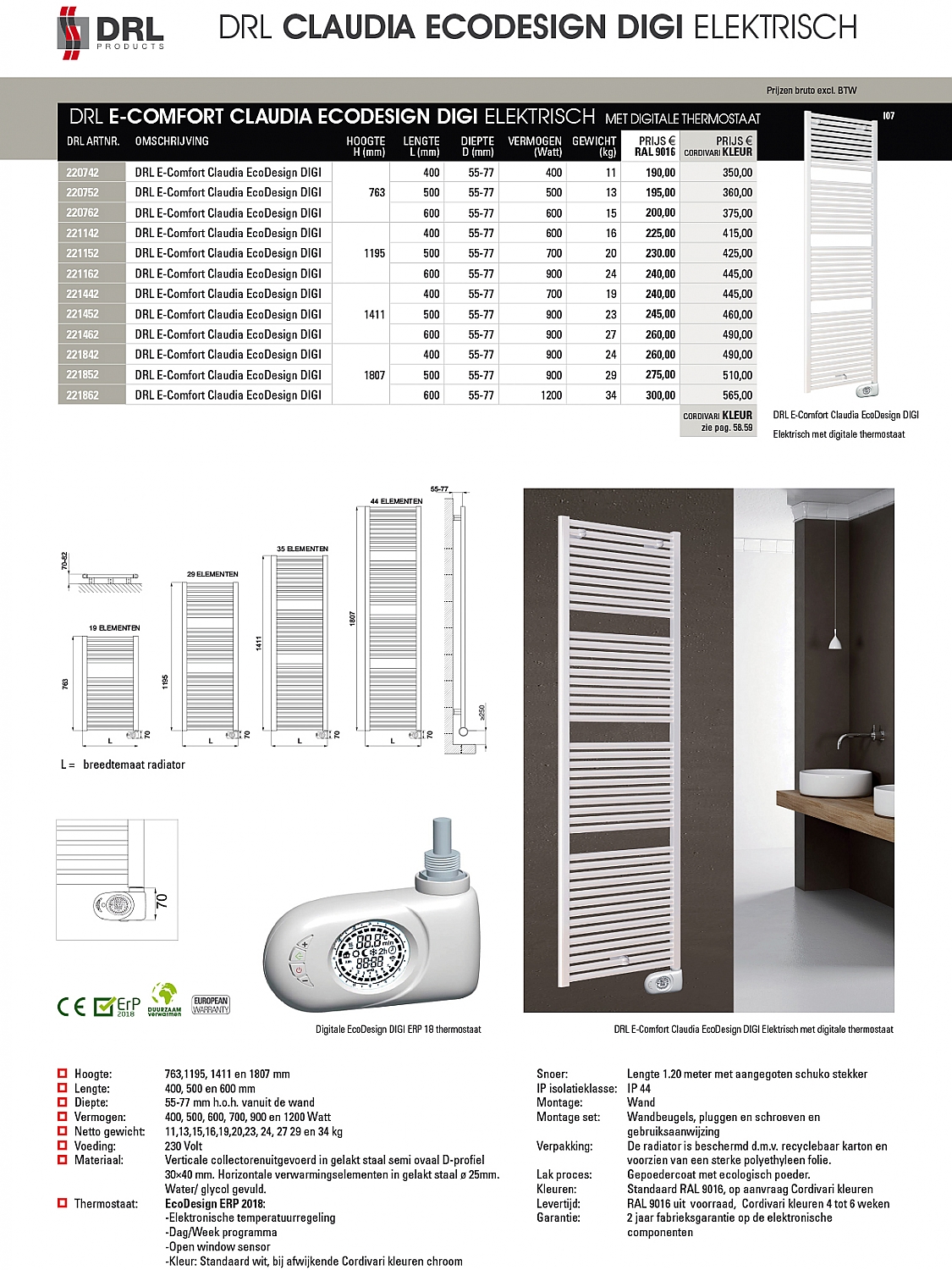 De DRL E-Comfort Claudia EcoDesign DIGI, is een klassieke en tijdloze elektrische handdoekradiator met digitale thermostaat werkend op basis van ruimtetemperatuur en voldoen aan de EcoDesign ERP18. De thermostaat is voorzien van een dag-weekklok, 2 uur timer Boost functie, Open Window sensor, antivorst en kinderslot. De Claudia EcoDesign DIGI elektrische handdoekradiatoren zijn leverbaar in de hoogtematen 763, 1195, 1411 en 1807mm en in de breedtematen 400, 500 en 600mm en zijn standaard leverbaar in de RAL kleur 9016.De vermogens variëren van 400 t/m 1200 Watt.