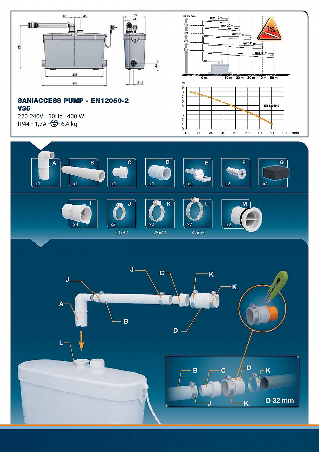 De opvoerhoogte van de Saniacces Pump is verticaal 5 meter en horizontaal 50 meter dit via een afvoerbuis met diameter 32 mm.