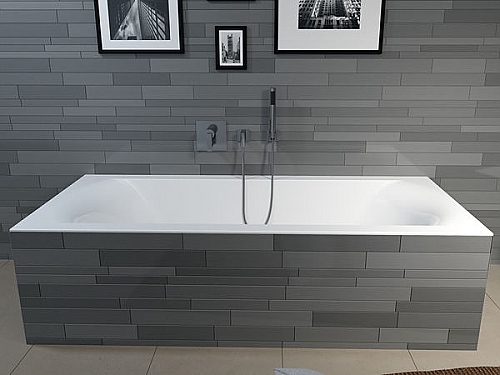 Inbouwbad, met lage badrand, hoogglans wit acryl, rechthoekig met afgeronde binnenvorm, afvoer aan de zijkant. Tevens verkrijgbaar met de whirlpoolsystemen: Air, Flow, Joy of Bliss.