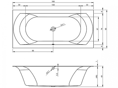 Inbouwbad, met lage badrand, hoogglans wit acryl, rechthoekig met afgeronde binnenvorm, afvoer aan de zijkant. Tevens verkrijgbaar met de whirlpoolsystemen: Air, Flow, Joy of Bliss.