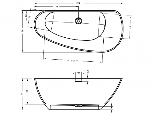 Vrijstaand, solid surface afgeplat eivormig bad, met inwendige overloop en pop-up. Geen whirlpoolsystemen mogelijk.