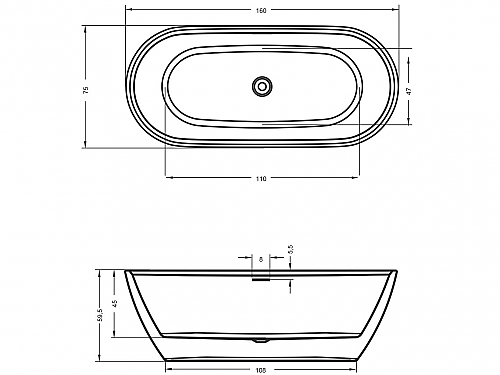 Vrijstaand, hoogglans wit acryl dubbelwandig bad, met ingebouwde overloop en pop-up. Geen whirlpoolsystemen mogelijk.